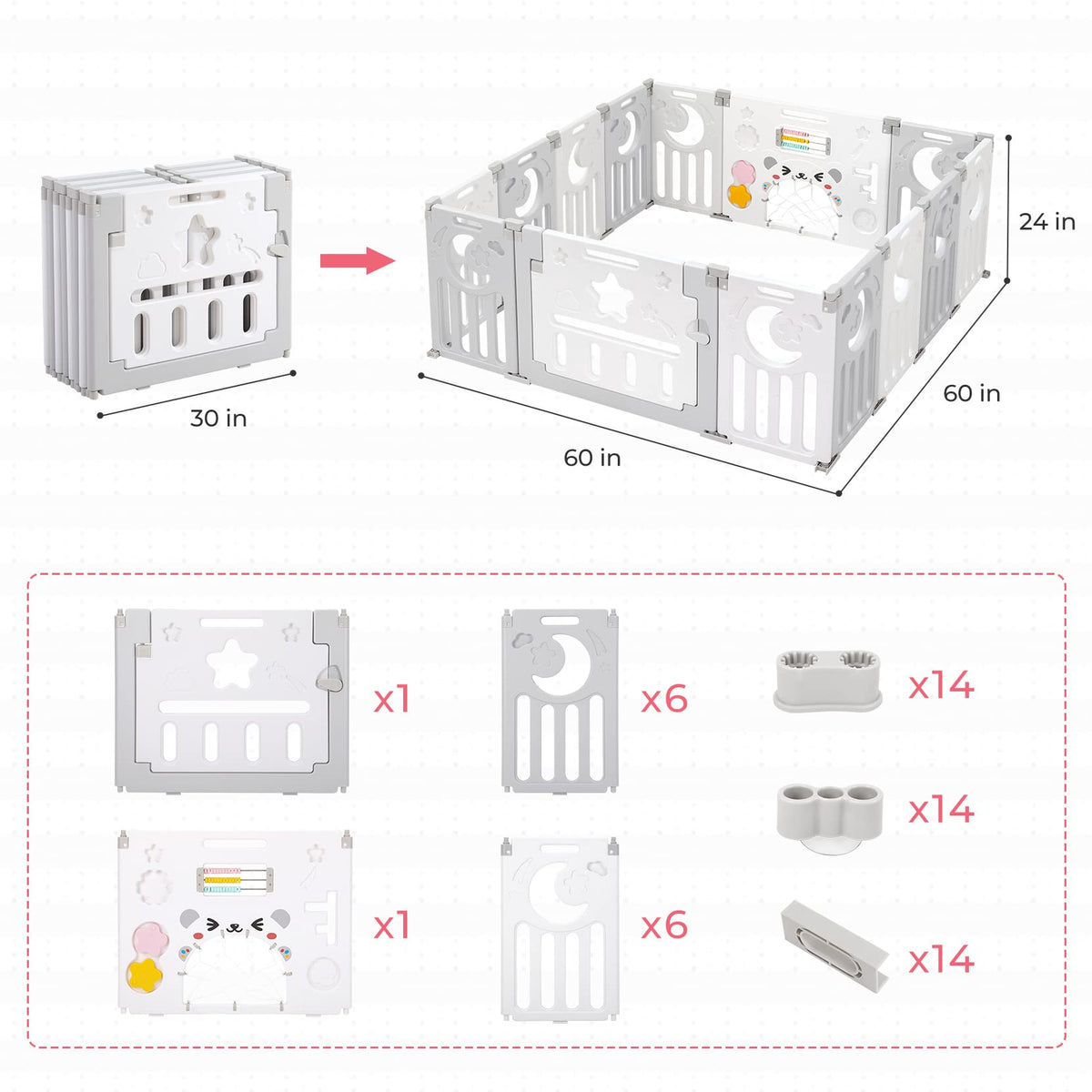 - 【ADJUSTABLE SHAPE & SIZE】14 panels can form a foldable playpen measuring 60x60x24 inches, covering over 25 square feet, with the flexibility to switch to different shapes such as round, rectangle, and square. You can also adjust the size of the playpen by increasing or decreasing the number of panels to fit any space.