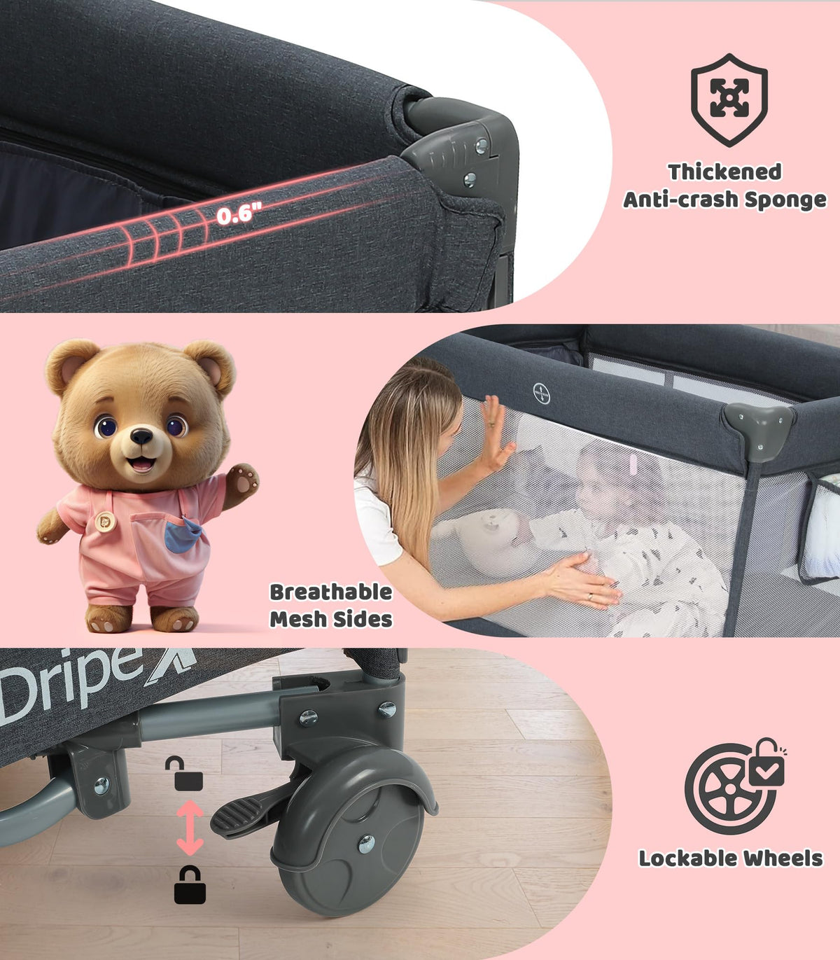 Dripex Pack and Play, 5 in 1 Baby Bassinet Bedside Sleeper, Baby Bedside Crib with Mattress, Changing Table, Removable Rocker, Foldable Playard for Newborn to Toddlers, Portable Playpen, Dark Grey